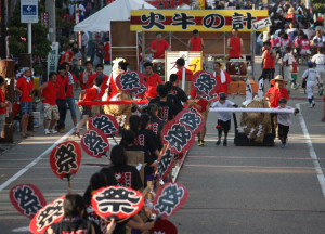 平成27年7月25日(土)、毎年恒例の「メルヘンおやべ源平火牛まつり」が、石動商店街において開催されました。まつりの目玉である、重さ約650㎏のわらで作った火牛を4人1組で引っ張る「義仲・火牛の計レース(大人の部)」には全国から出場者が集まり、激しいレース展開を見せ、観客を沸かせました。その他、太鼓や演舞などのステージ披露やご当地キャラとのふれあい、まち流し、屋台村など、参加者は思い思いに暑い夏の夜を楽しんでいました。来年はさらにパワーアップしてまつりを盛り上げます。お楽しみに!